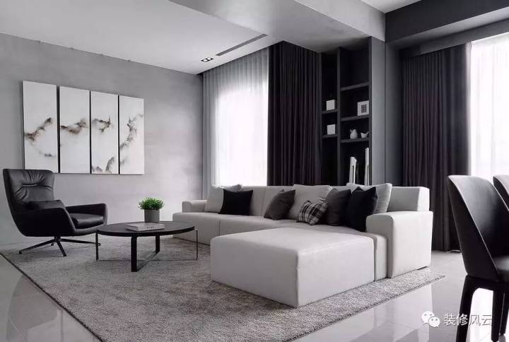 33 软装的配色可以延续硬装的基调,比如黑窗帘、黑茶几、黑灯罩、黑相框、白沙发、白地毯,将黑白灰贯彻到底。