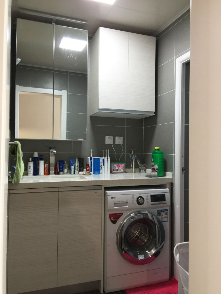 卫生间干湿分离,干区的镜柜超高,储物力超强,但这种大尺寸的镜柜,要设计成两块镜门,用一大片镜子会不安全。