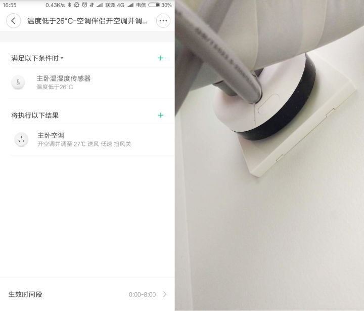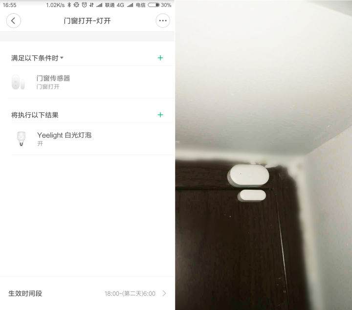 之前说的门窗传感器,在卧室可以有其他玩法,比如装在窗上,在雾霾随时来袭的冬天,开窗时,自动关净化器,关窗时,自动开净化器。