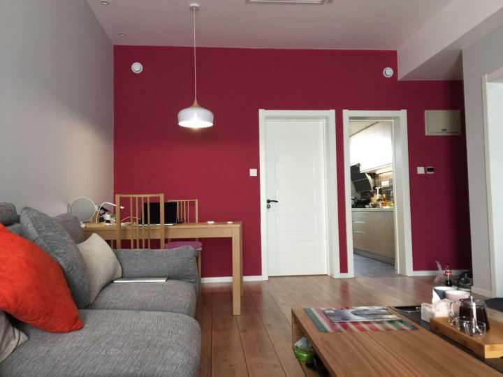 进门来,这面酒红色的墙,是潇潇得意的创意:家里有一抹亮色,心情会跟着明朗(拍照也好看~)