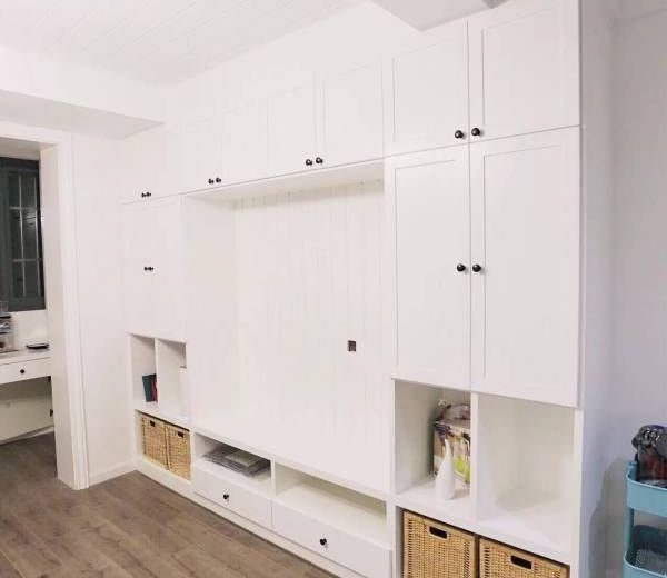 一侧设计成收纳区,换鞋凳、鞋柜、抽屉、挂衣钩、放包包的格子全都有,柜门上小巧的金色拉手,是Blue特地更换的。