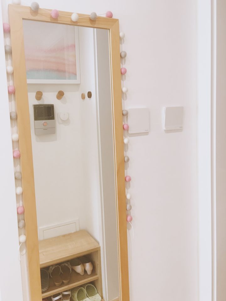 收纳区对面是穿衣镜,实用的同时还有扩大空间的效果,镜子里那幅画,用来遮挡电表箱。