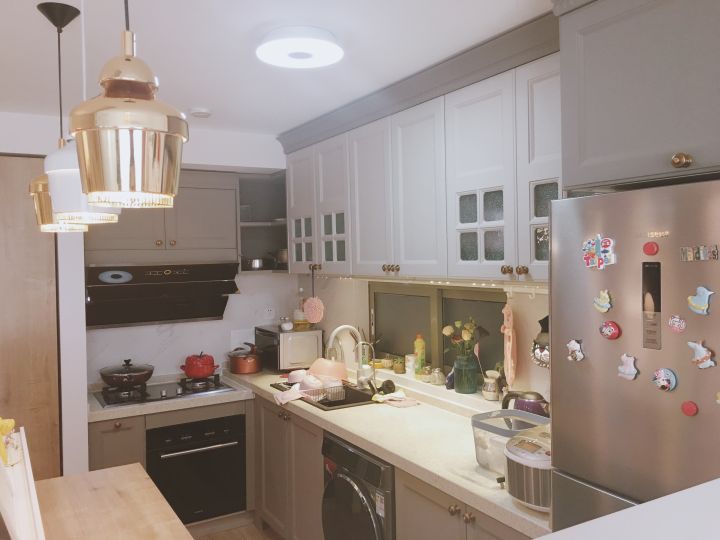 地柜被洗碗机、洗衣机、净水器、垃圾处理器和冰箱占得满满当当,剩余空间不多,必须高效利用,像洗碗机左边的一丢丢空间,就装了拉篮,放上油盐酱醋,正好炒菜时取用。