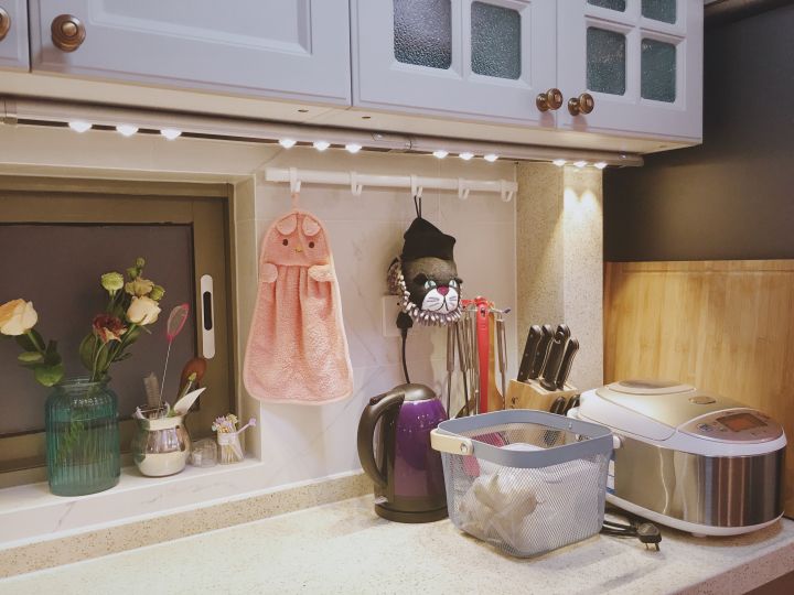 在橱柜下面安装触摸灯,切菜洗碗都亮堂堂的,一个人做家务也不孤独了。
