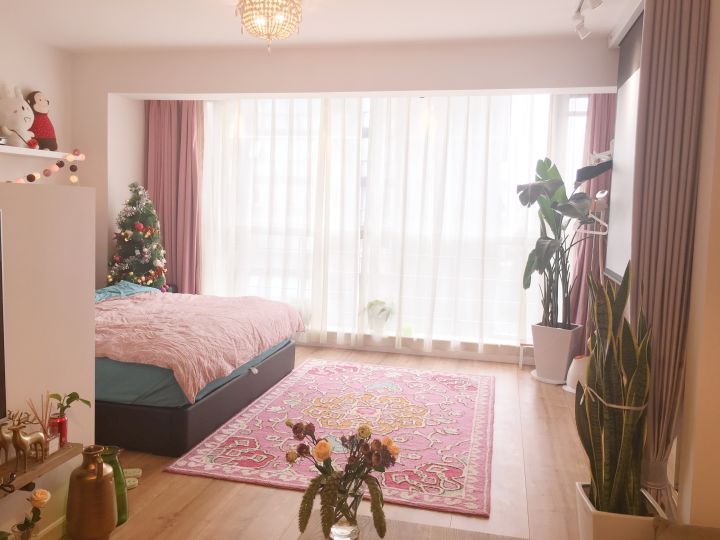 床和衣柜之间还有很大空地,铺上地毯,把衣柜里的穿衣镜拉出来,就能对着镜子换衣服、做瑜伽,偶尔放个音乐跳个舞,放松high一下~