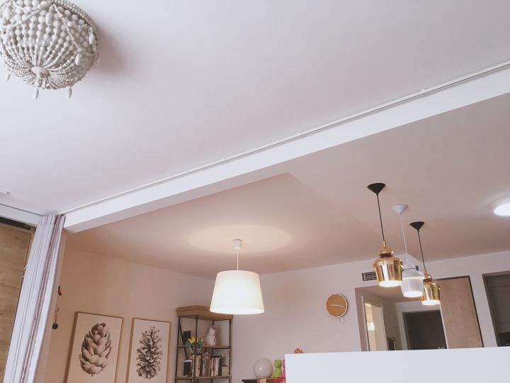吊顶延伸出一条,连接到衣柜侧墙,既是客厅和卧室的分界,又能用来安装卧室帘的轨道。
