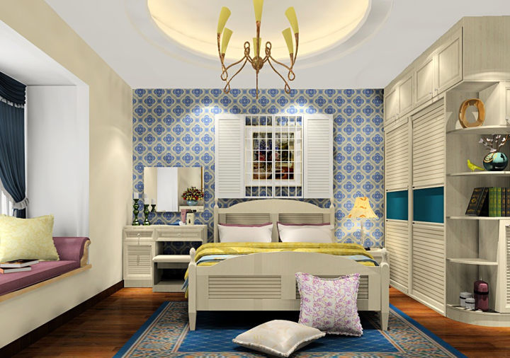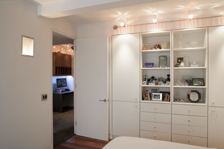 ② 主卧:通顶大衣柜+1.8双人床(高箱储物床)+小书柜+办公桌(可以兼作化妆台)+沙发+电视