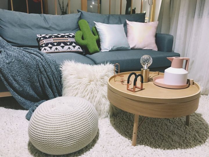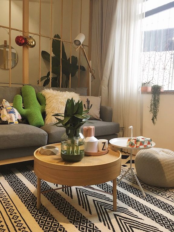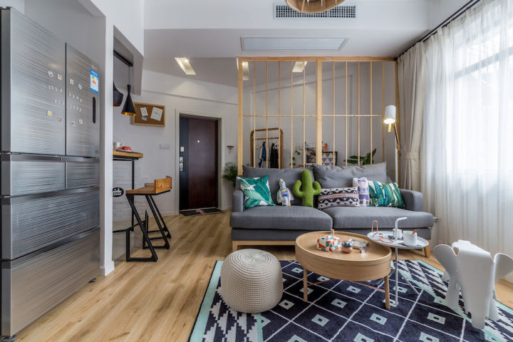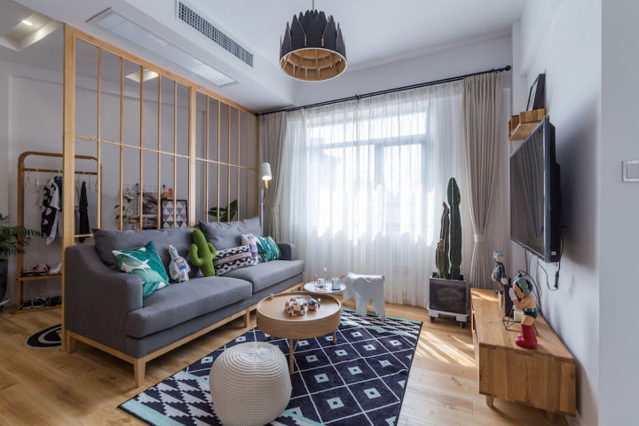 沙发背靠木隔断,尺寸也跟木隔断一致,很搭。各式各样的抱枕当然不能少,地毯也是变换风格的神器。冬天换上毛茸茸的羊毛地毯,感觉客厅都会温暖很多。