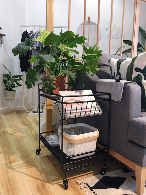 除了小茶几,沙发旁边还放了一个小推车来满足客厅的收纳。