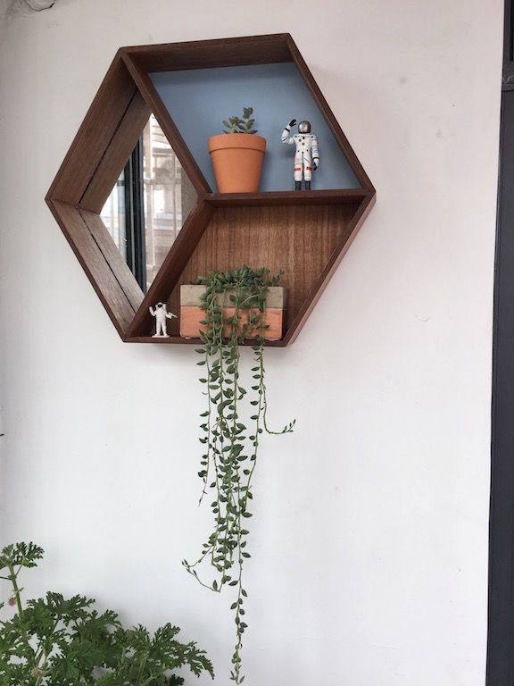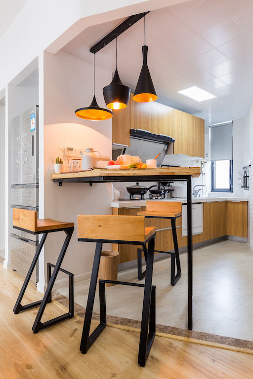 吧台的形状要根据厨房的布局调整,所以只能现场定制,吧台的架子是师傅用角钢焊好固定在墙面上的,台面是松木拼接,再刷漆。吧凳虽然是网购的,但选择的时候,尽量选择了一样的风格(木+黑色金属)。