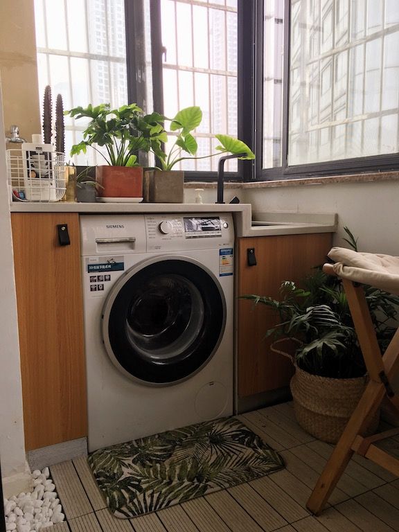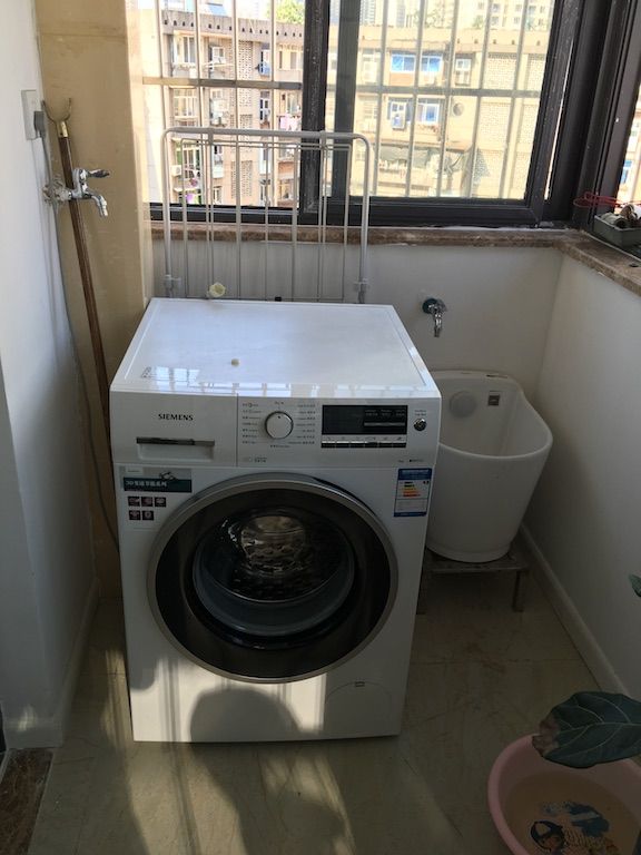 洗衣机也被放在了卧室的阳台,但最开始这里只是简单的摆放洗衣机,洗衣机旁边还被老妈强迫安装了一个拖把池,是不是略丑……