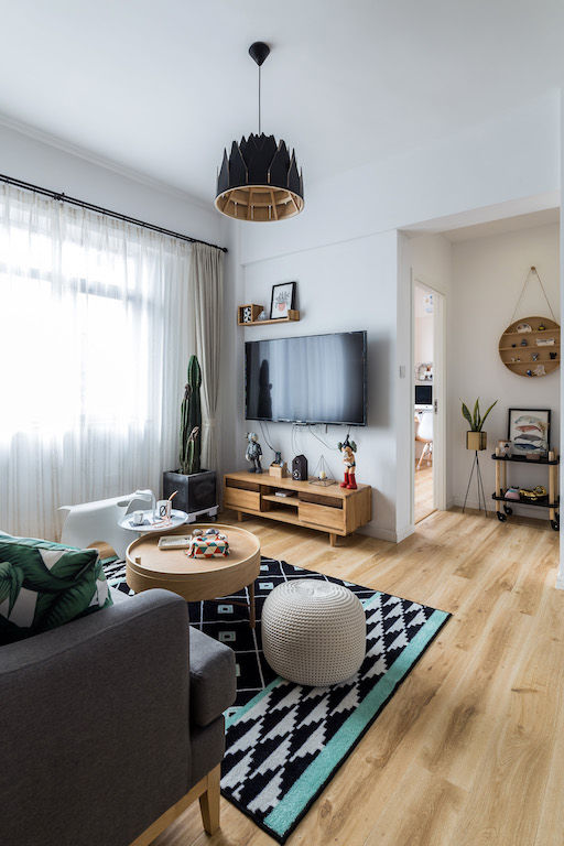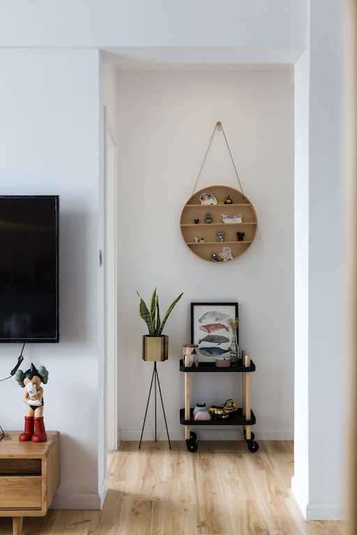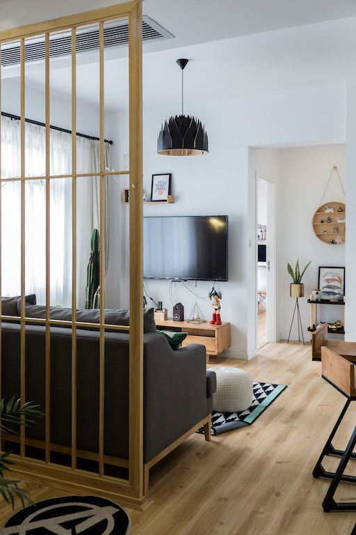 打着滚的想要一个玄关,就在这里做了一个隔断,木质的隔断刚好把异形的空间划分出来成为玄关,客厅变成了四四方方的区域。