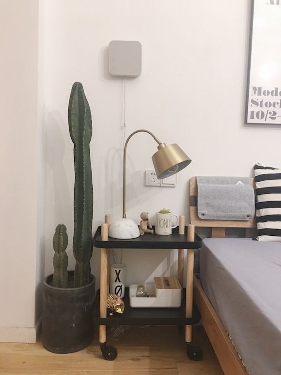 床边muji的蓝牙音箱,周末醒来就会连上放会歌,享受赖床时光。床头柜原本是中规中矩的日式实木柜,后来换成了灵活的小推车,感觉更加洋气。