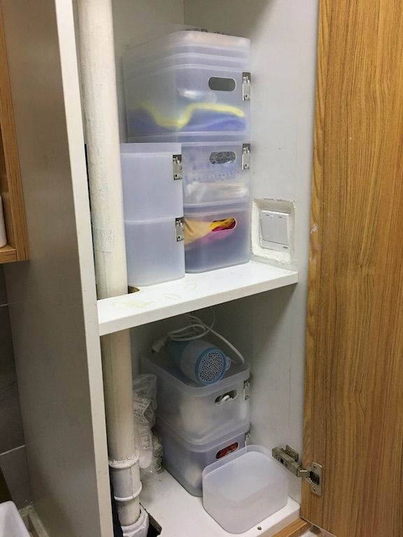 卫生间原本有根难看的下水管道, 做了个收纳柜把它遮起来,再加上镜柜和台下柜,把小空间收纳发挥到极致,在买些收纳盒,藏得了很多盆盆罐罐。