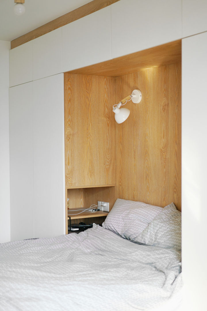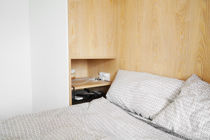 在床两侧做了隐藏式的床头柜,非常能装,而且放东西会很有安全感,不用担心东西会掉下来。