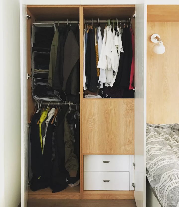 床的两侧各有一个1.2米宽的衣柜,柜子深度55cm。床头柜占掉了衣柜内部很大一部分空间,剩余部分被八顿分成了3个挂衣区和2个抽屉。