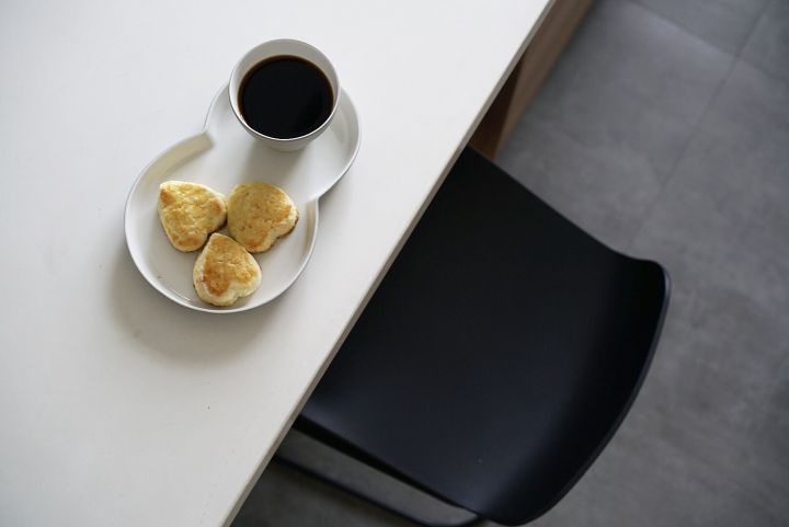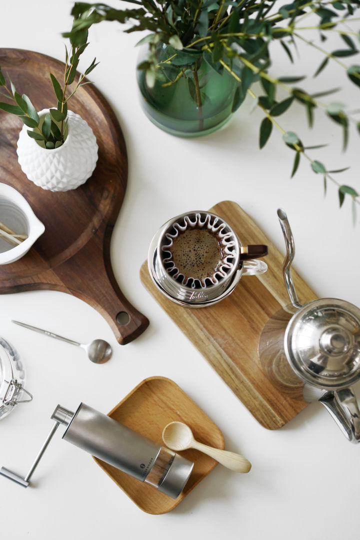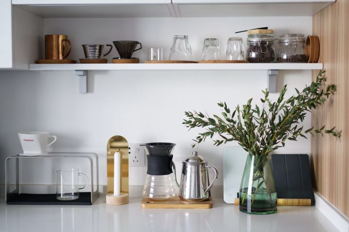 经常自己做咖啡,所以用具都没有收起来,右边的台面摆放了自己的用具,随用随取。