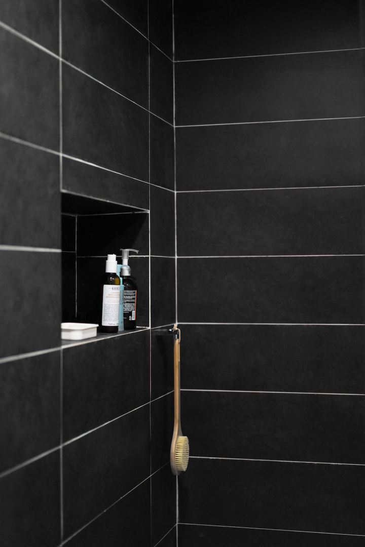 为了让小小的卫生间显得更高大,墙面用了20*60cm的大块瓷砖。还在墙壁上做了一个壁龛,放洗浴用品更方便。