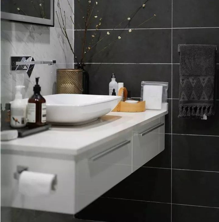 去选台盆的时候,一眼看中这个悬空的台盆柜,悬空的台盆柜,还装下了65cm宽的抽屉。