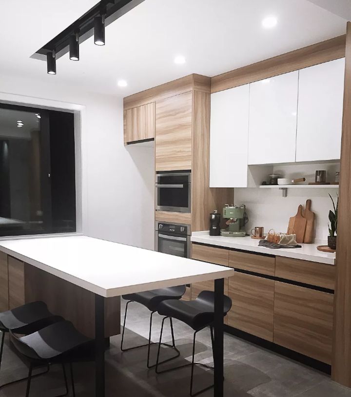 中岛的高度和左右两个操作台的高度一致,85cm,为了配合中岛的高度,选择了55cm坐高的吧椅。热水器藏在右边电器柜内。