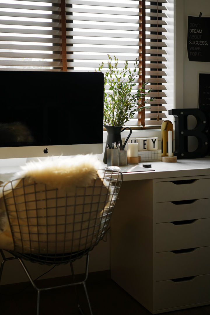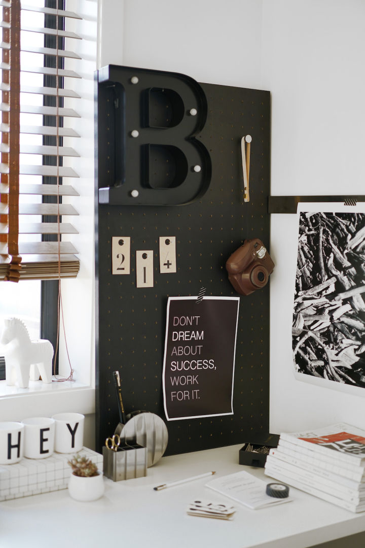 书桌的一角,放上了黑色的洞洞板,还有同样黑色系的字母灯。