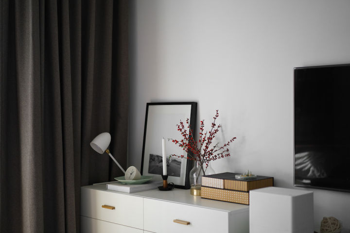 客厅的进深也就3米,已经摆放了电视柜和沙发,就没打算在沙发前摆放茶几,想要摆东西?