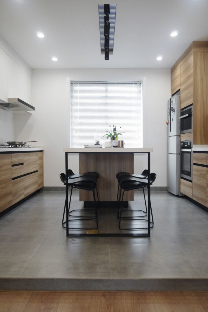 因为是卧室改厨房,所以需要煤气公司来改动管道,厨房地面也只好抬高了10cm。为了追求简约,整个厨房的布局,都是对称的。