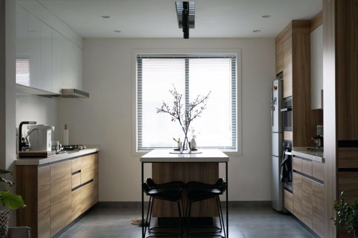 考虑到自己的生活习惯,八顿把北面的卧室做成了开放式厨房,而且还在厨房里做了中岛,让厨房兼具餐厅的功能。