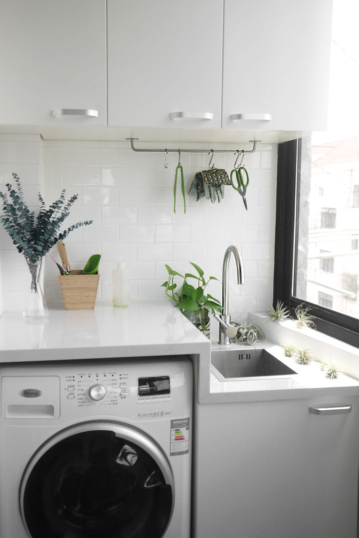 卧室的阳台比较小,在这里装下了洗衣机,留给洗手台的空间超级小,找了很久才找到了这个迷你的不锈钢水槽。