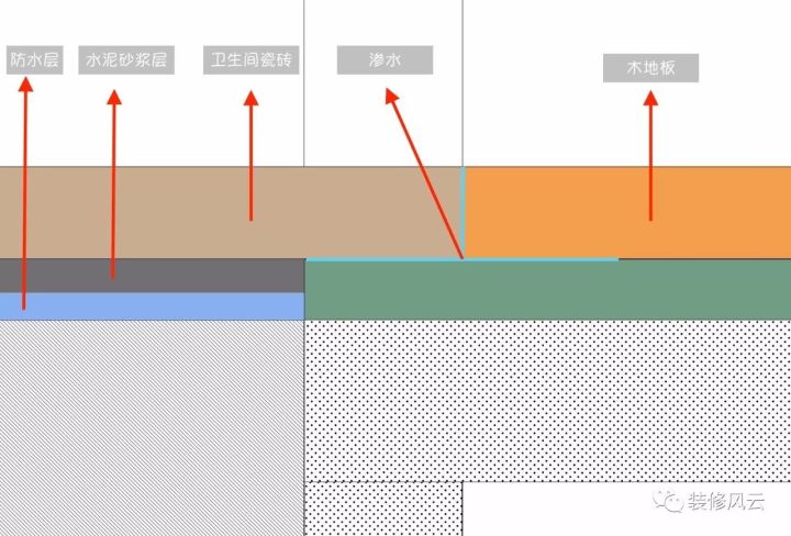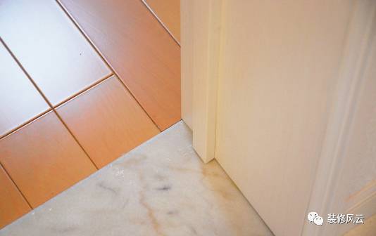 如下图,如果卫生间内的瓷砖,和卫生间外的木地板直接接触,这时候水就会慢慢渗透到木地板,甚至是其他地方,造成木地板的起拱和墙面的返潮。