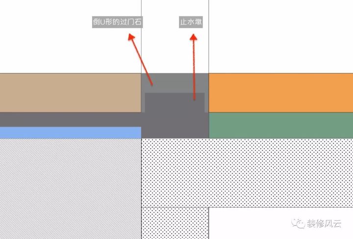 虽然表面的水分被过门石阻隔,但过门石下方的水,还是可能会渗透过去。这时候,在过门石下方,再加上一个止水墩,然后止水墩上也刷上防水,止水墩+过门石,双重保险。