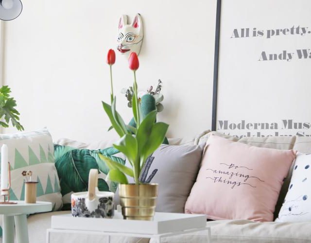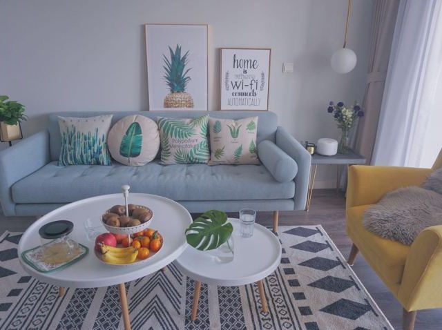 糖果色之类的明亮的彩色,主要用于提高室内的亮度,打破单调,可以是地毯、抱枕,也可以是小家具。使用面积不多,目的就是“画龙点睛”那一笔。
