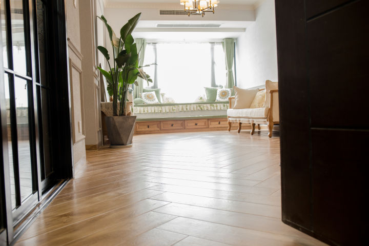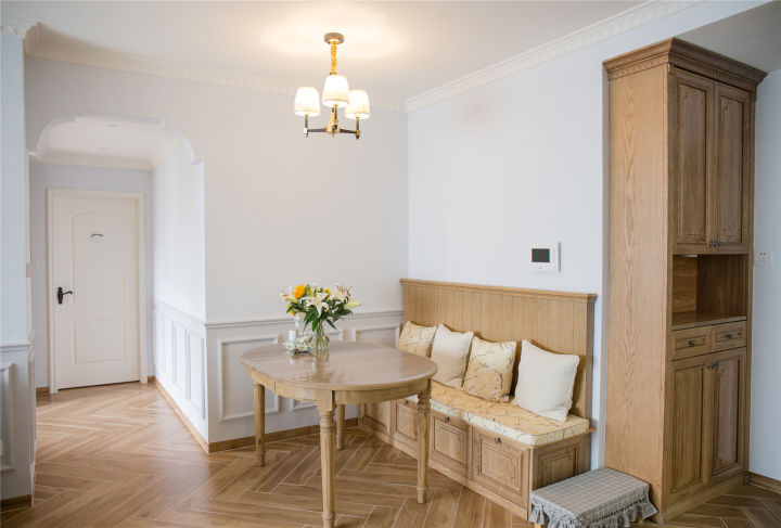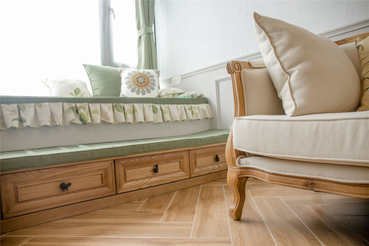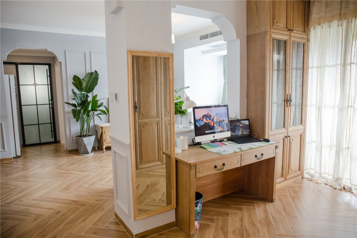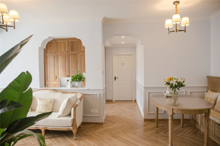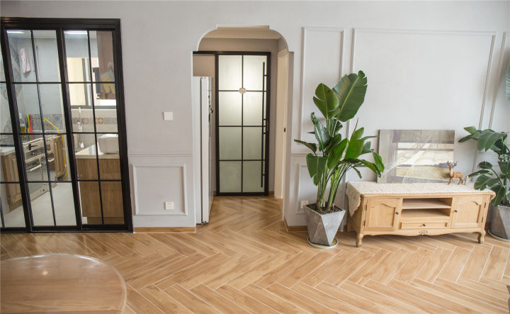 法式风格,地板用人字铺最宜打造复古情调,恍惚回到法语电影里的怀旧时光。Fancy家开门即见木纹砖铺地,人字形向前延伸,有强烈的指向性,仿佛主动把人引进家门。
