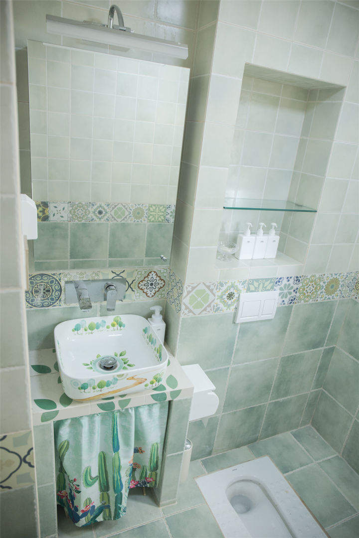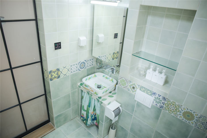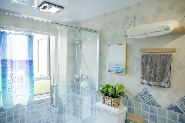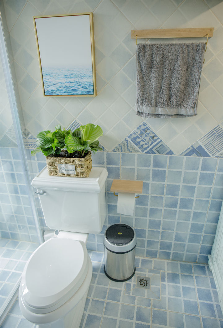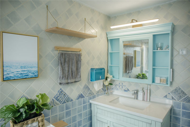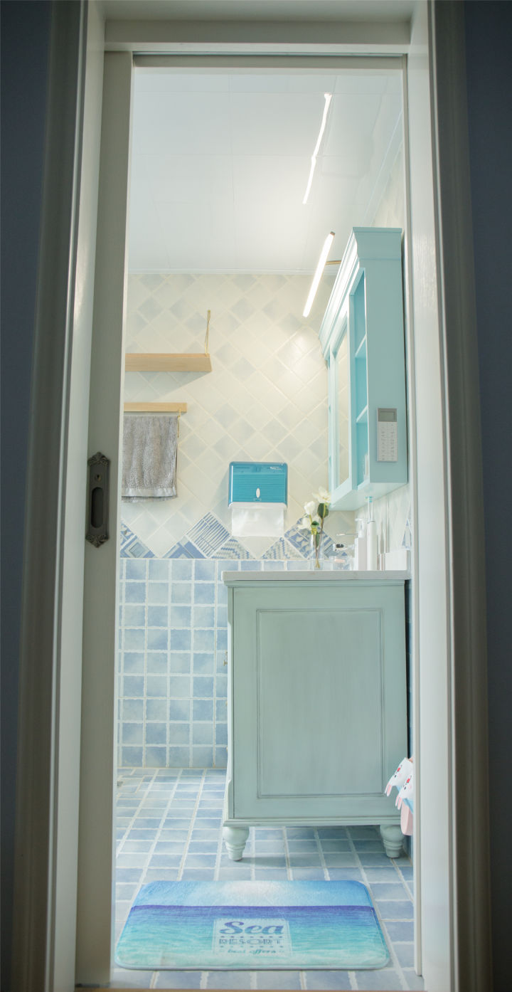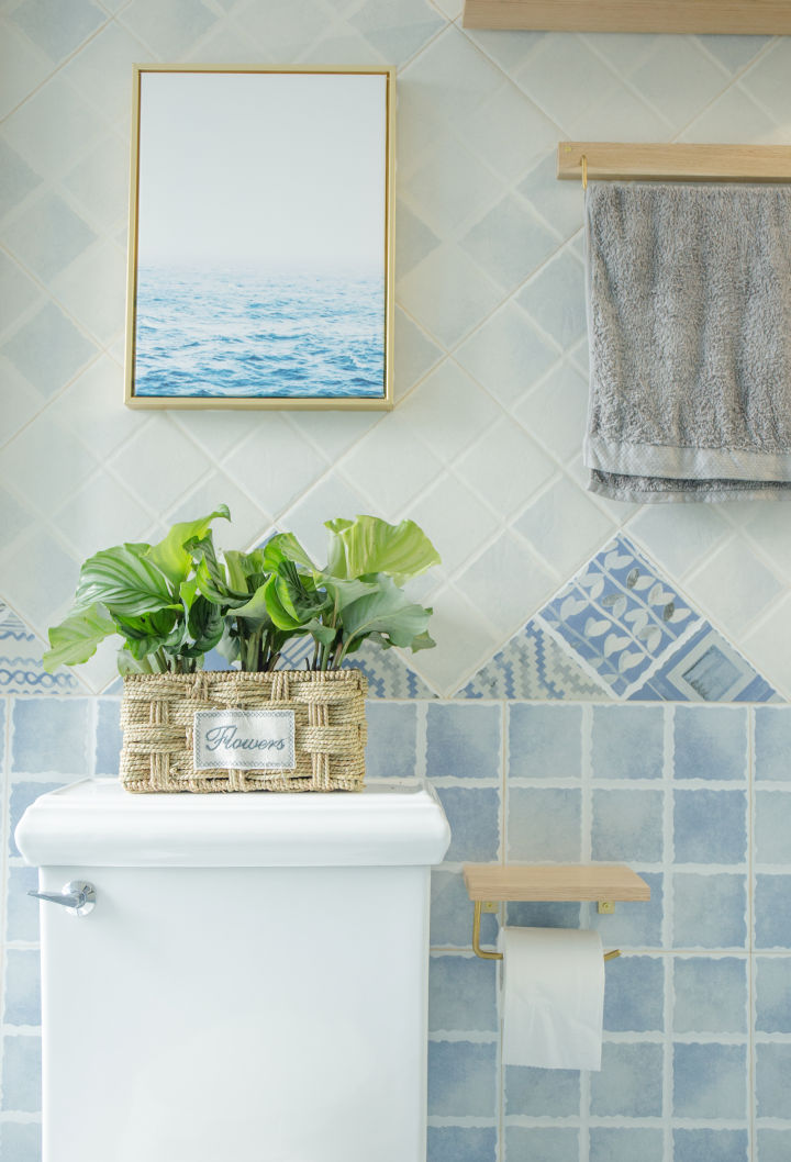 腰线以下深蓝地砖直接上墙;腰线是Fancy特别设计的花砖斜贴;腰线以上浅蓝墙砖斜贴。浴室柜、纸巾盒、乃至装饰画,都延续蓝色搭配。