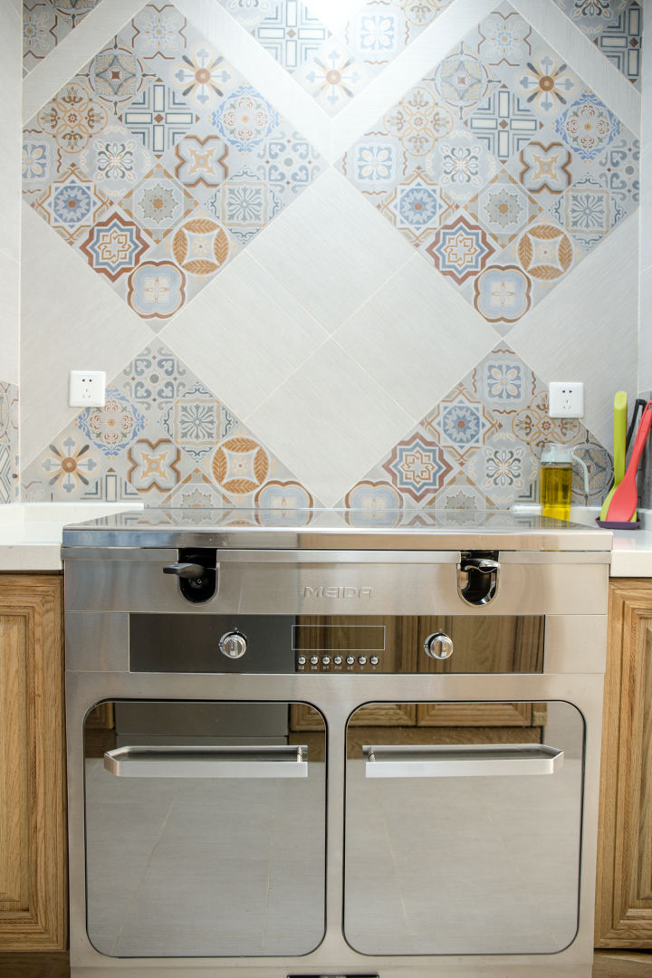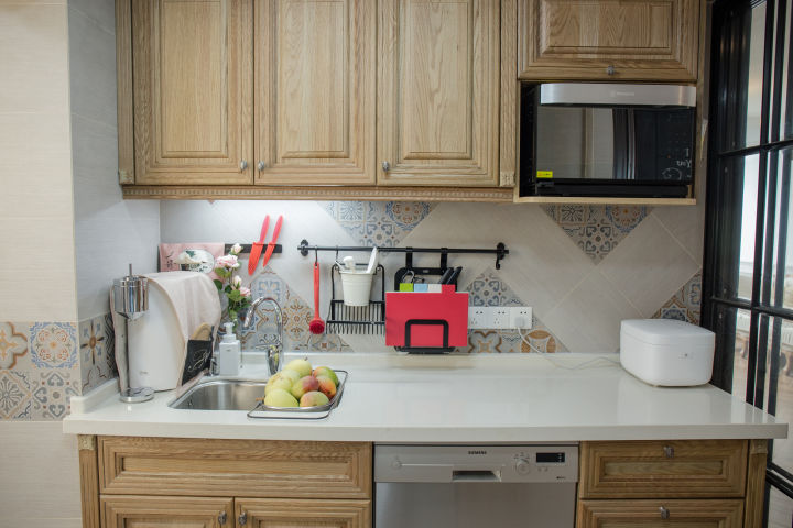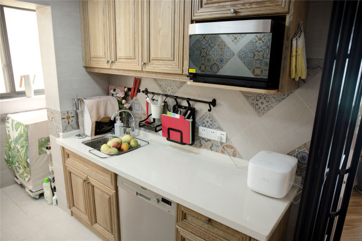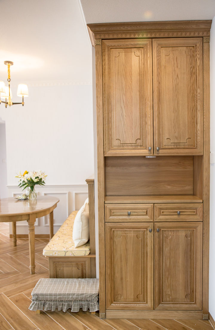 橱柜门板是美国红橡实木,做法式雕花。Fancy希望橱柜和家具一样也展现木蜡油质感,但木蜡油属于开放涂料,防水防污性较差,不适合于厨房环境,权衡之下,橱柜厂家在柜门上刷的清漆,相当薄一层,摸上去手感光滑,但光泽度是亚光,神似木蜡油。