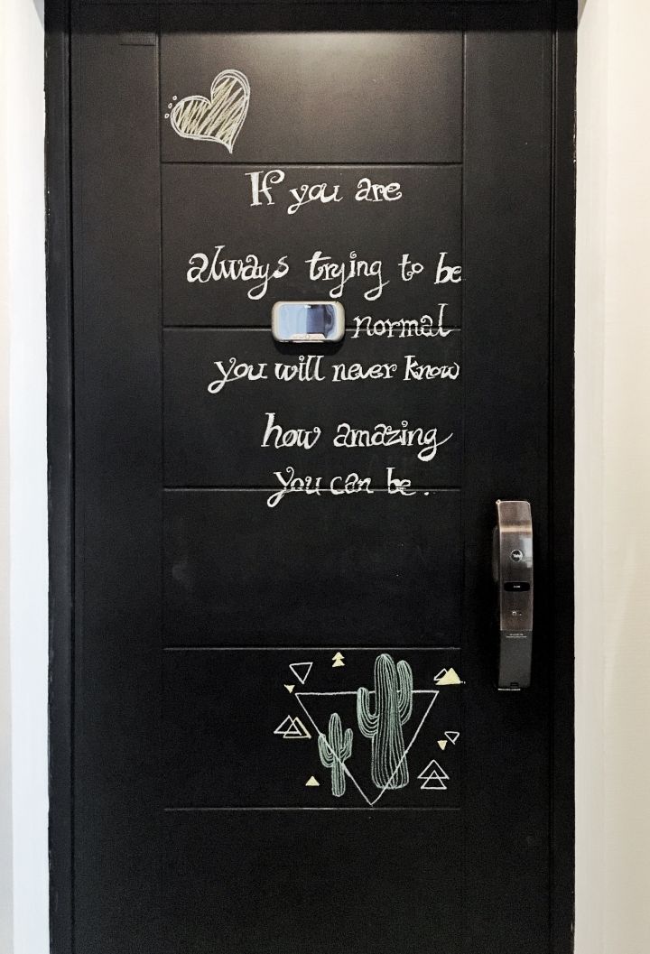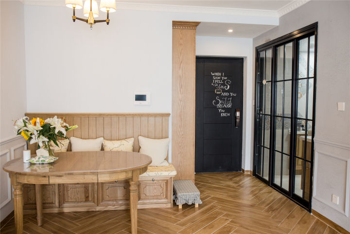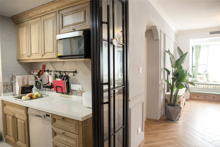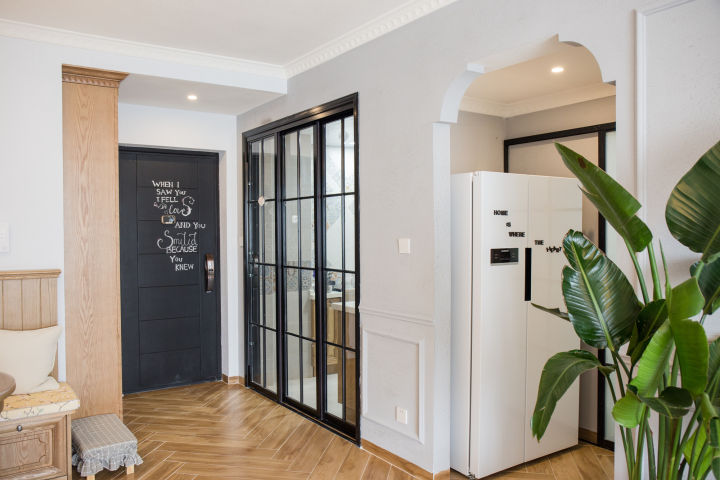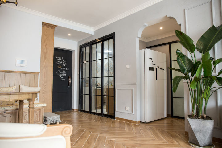 厨房用黑框玻璃门,和入户门黑板漆呼应,在全屋浅色怀旧的基调中,加入一点黑色提提气!