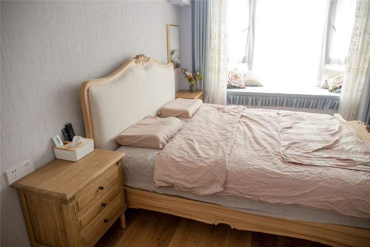 床头背景墙刷淡灰硅藻泥,做拟丝纹,仿佛下雨;其余三面墙喷浅蓝硅藻泥,做颗粒感。地面用了真正的木地板。