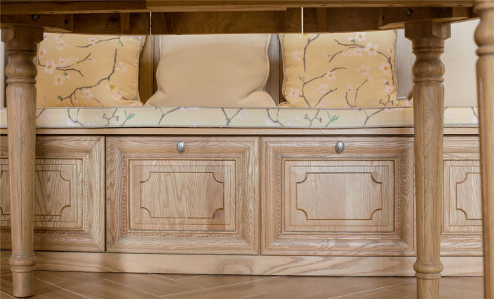 卡座的板材和木蜡油工艺,都和玄关柜的一样,橡木黄色,很搭鹅黄印花的坐垫和抱枕。