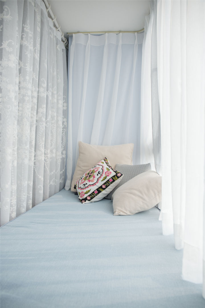 如果营造梦幻的飘窗效果?外侧轨道挂一层U型白纱,内侧罗马杆挂一层刺绣白纱加一层浅蓝遮光布。