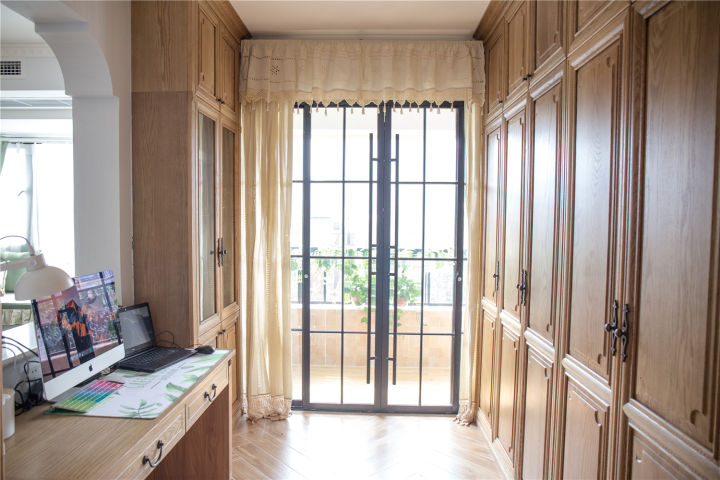 窗洞后的开放区域,作为工作区&衣帽间。左墙定制书桌书柜,右墙定制衣柜。柜体全部到顶,有挺拔向上的仪式感。