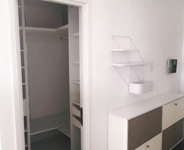 衣帽间的柜子是L型,用2.7米顶天立地的板子来做,效果很棒,储物能力和1~2个大衣柜相当。