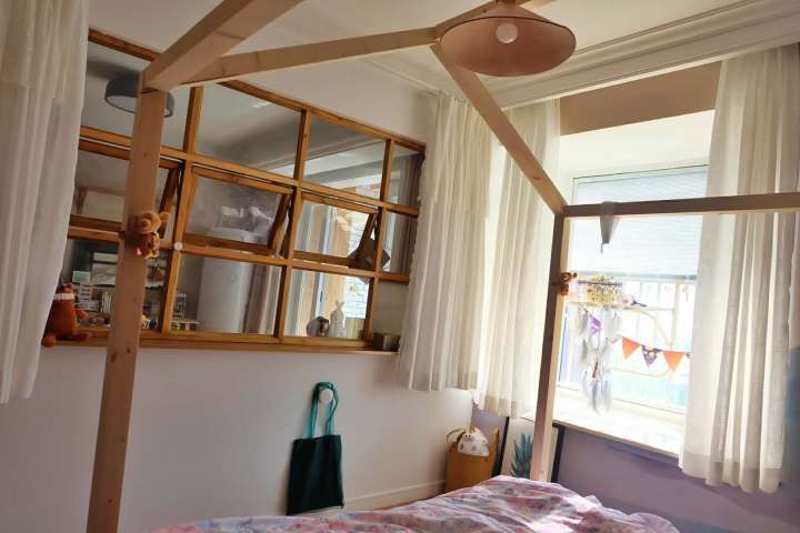 如果卧室采光不够好,开一扇室内窗可以让卧室的通透感更强。为了保证卧室的私密性,可以配上布帘、百叶或者安装磨砂玻璃。