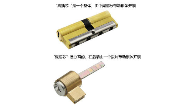 “真插芯”的锁芯是穿过锁体的,两者是一个整体;而“假插芯”的锁芯是在锁体外边的,两者是分离的。