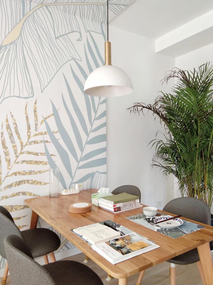 ▲屋主二花家是餐桌区域用了墙布(和墙纸效果一样,只不过材质是布),为了把餐区从客厅里强调出来
