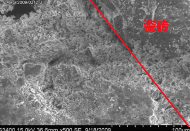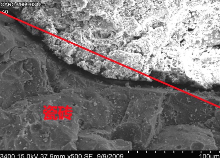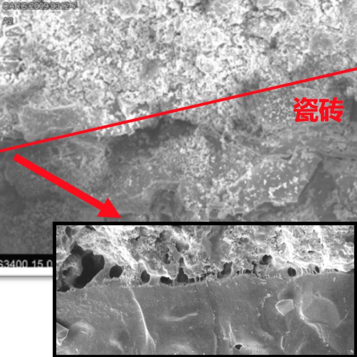 再看微观图,是粘接剂跟低吸水率瓷砖的结合,看上去还是很紧密的,至少比第一张图强得多:
