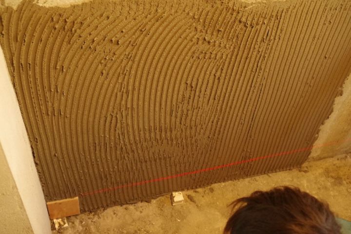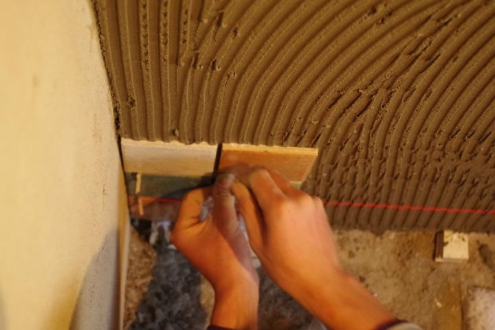 然后将搅拌好的粘接剂用专用齿形刮刀成排涂抹在墙面上,并用专用的齿形刮刀把粘接剂刮出条纹状。