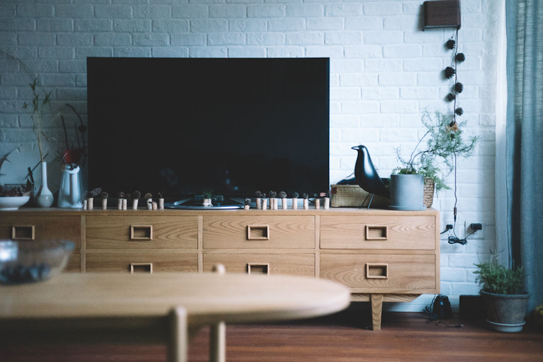 当然也有电视直接放在柜上的,灵活度比较高,随时可移动电视;电视机和墙面之间也会有足够的空间,利于散热;即使不把电视线埋进墙,电视柜也能把线挡得七七八八,视觉上没太大影响。