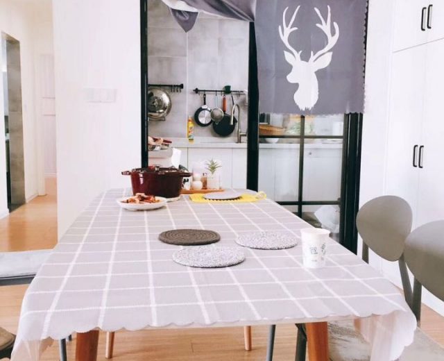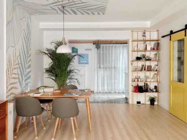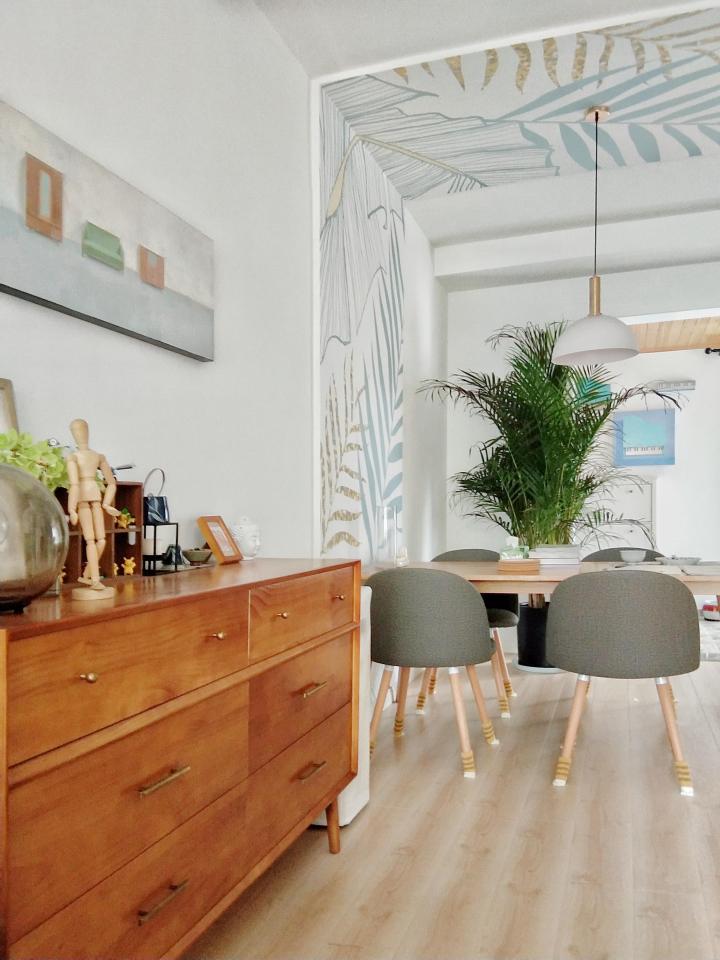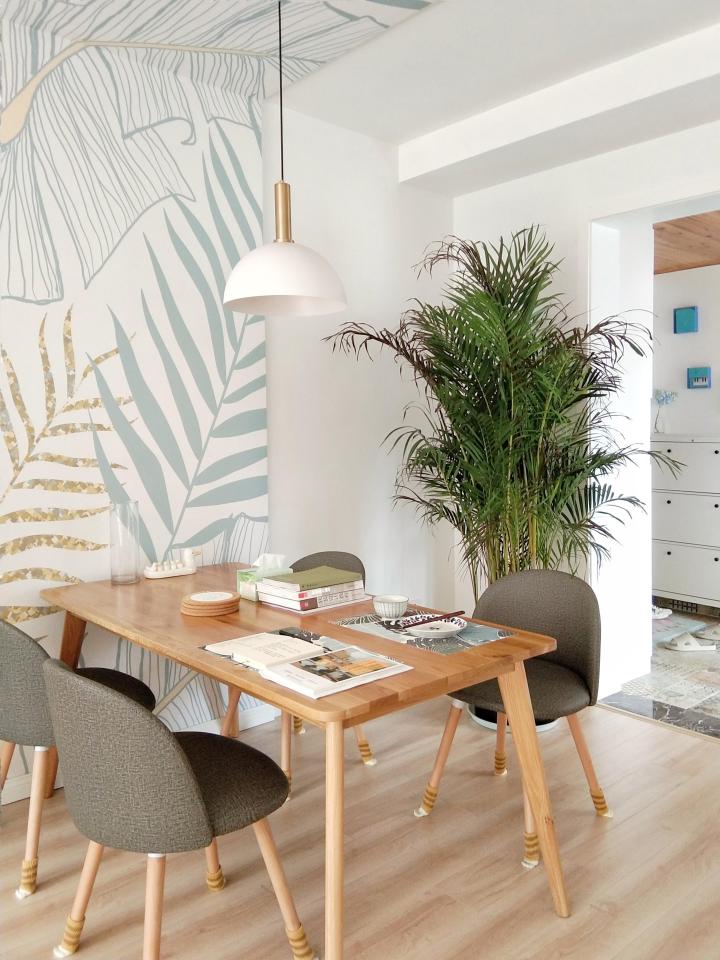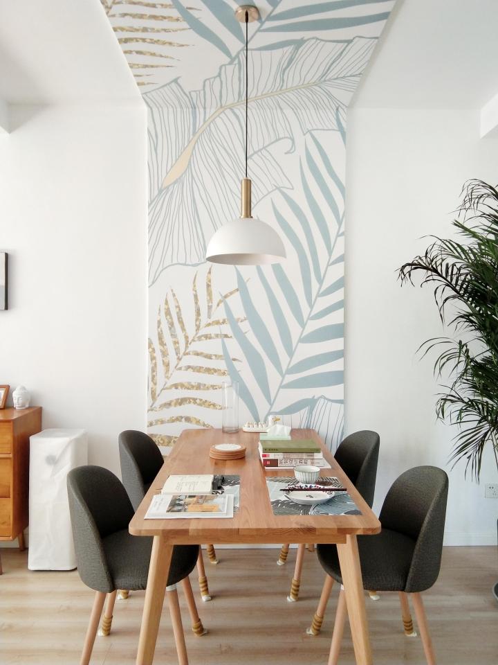 玄关进来就是餐厅。客餐厅同在一个空间,用墙布从低贴到顶,勾勒出餐厅的区域。