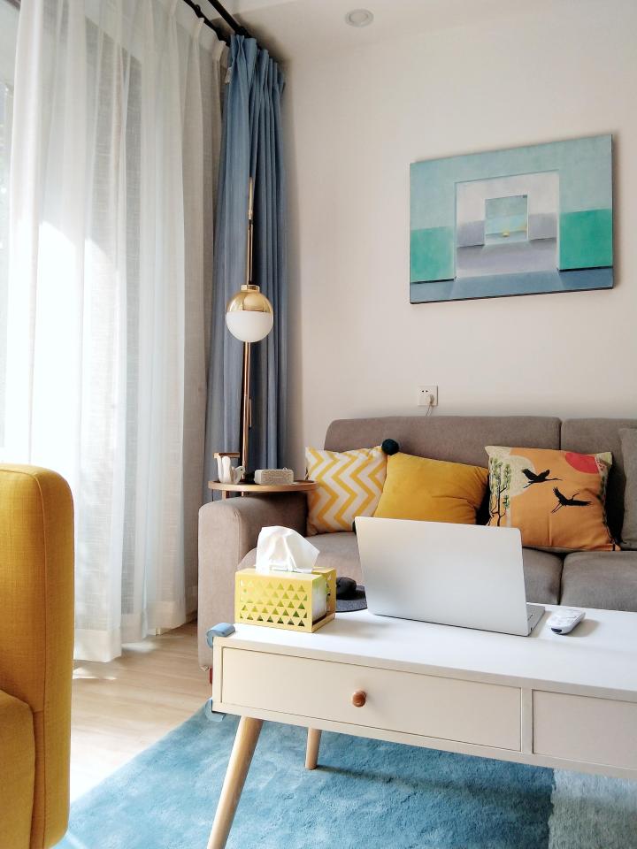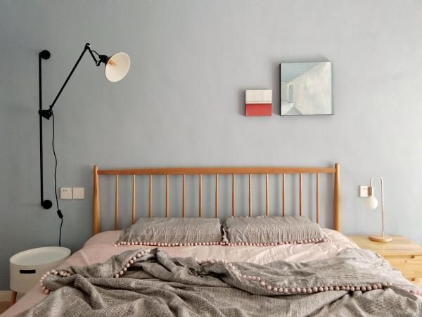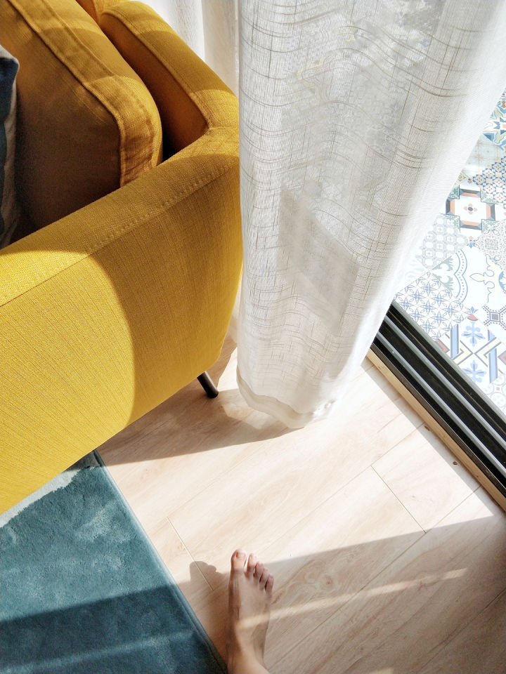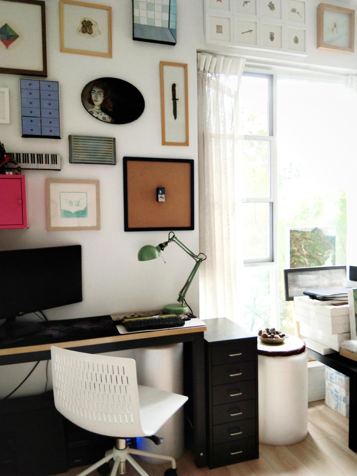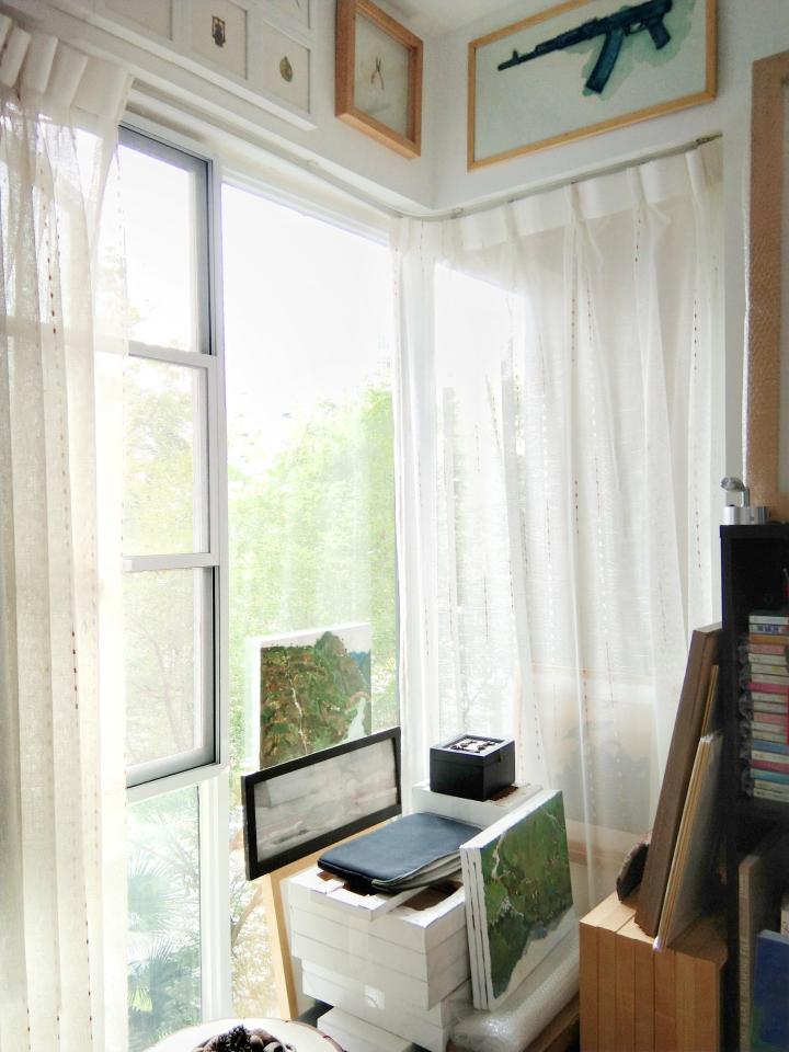 为了画画,必须让阳光均匀地照进来,就用了白纱帘。反正也不是很注重隐私的房间,挂一层纱就可以了。