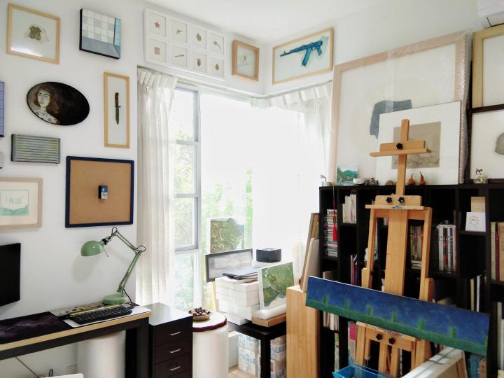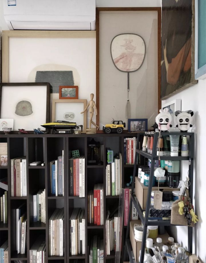 另一边,见缝插针地收纳各种绘画作品、颜料和书籍。